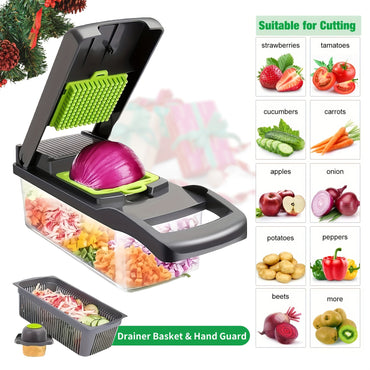 16 In 1 Vegetable Chopper - Multifunctional Manual Food Slicer Dicer, Kitchen Cutter With Container, Mandoline For Onion, Carrot, Garlic - Uncharged Plastic Kitchen Gadget Set With Drain Basket