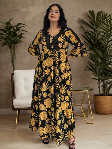 Plus Size Women Printed V neck Stitching Bohemian Holiday Dress