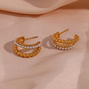 Simple Light Luxury Ear Ring Earrings Jewelry Stainless Steel Double Layer Beads Pearl C Shaped Stud Earrings for Women Accessories