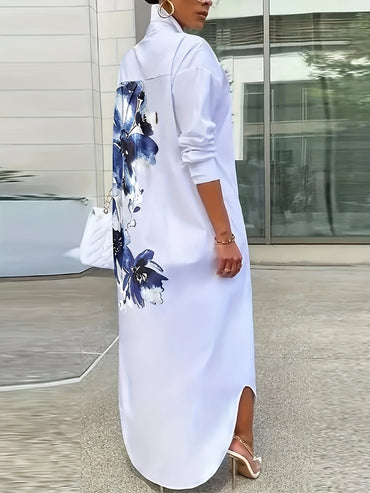 [Plus Size Floral Print Dress] Long Sleeve Plus Size Floral Print Shirt Dress - Button-Up, Non-Stretch Polyester for Spring/Fall