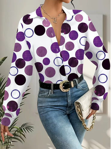 [Polyester Elegant Shirt] Polyester 1pc Women's Elegant Shirt - Long Sleeve Polka Dot Print Top with Lapel Collar, Button Front, Split Sleeves, Mermaid Hem - All-Season Casual Wear