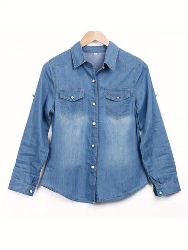 [Slim Denim Shirt Jacket] Slim Denim Shirt Jacket - Women Fashion Casual Solid Color Long Sleeve Button-Up