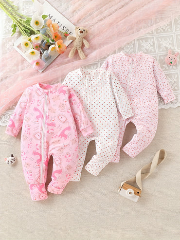 [Soft Baby Romper] 3pcs Soft and Comfortable Baby Girl's Romper Set | Long Sleeve Jumpsuits with Zipper, Cartoon Animal Polka Dot Print Onesies, for Outdoor