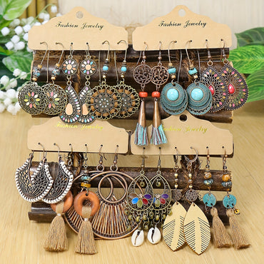 12 Pairs of Bohemian Vacation Style Retro Style Women's Fashion Dangle Earrings Set, Old Geometry Zinc Alloy, Rhinestone Embellished Hand-woven Fan-shaped Round PU, Fabric Tassel Fashion Personalized Earrings Multi-Set, Daily Life, Outing, Work, Street Ph