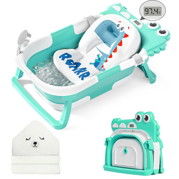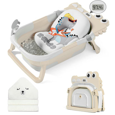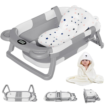 MoreFeel Collapsible Baby Bathtub for Newborn with Thermometer & 1 Hooded Towel & 1 Soft Floating Cushion,Portable Travel Bathtub with Drain Hole, Durable Foldable Baby Tubs for Infants to Toddler