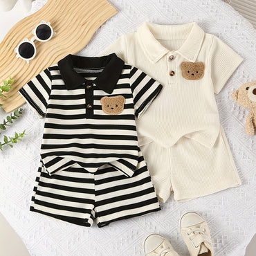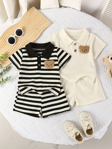 Summer New Boys' Collar Bear Embroidery Solid Color and Striped Short Sleeve Top with Shorts 4pcs Set, Perfect for Outdoor