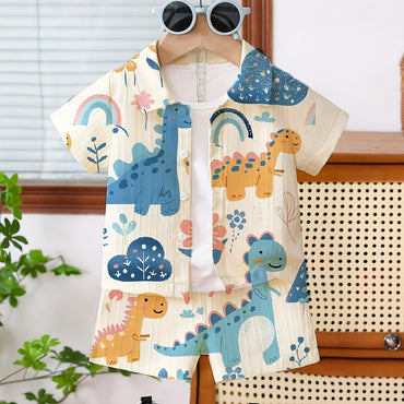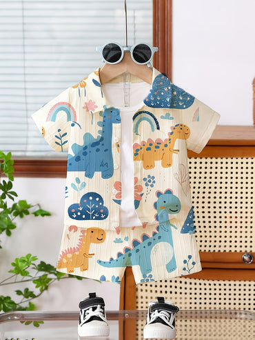 2pcs Dinosaur Print Short Sleeve Shirt & Shorts Set for Baby Boys - Casual Summer Outfit with Rainbow & Cloud Design, Polyester Fabric, Perfect for Beach & Holiday, Holiday Outfit|Playful Print|Polyester Fabric, Baby Clothes, for Outdoor