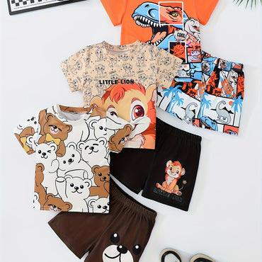 6pcs Cute Animal Print Shorts & T-Shirt Set for Newborn Boys - Lightweight Polyester, Summer Essentials with Bear, Lion, and Cartoon Designs, Black and White Sneakers Included, Newborn Clothing | Playful Animal Print | Stretchy Fabric, Baby Clothes, for O