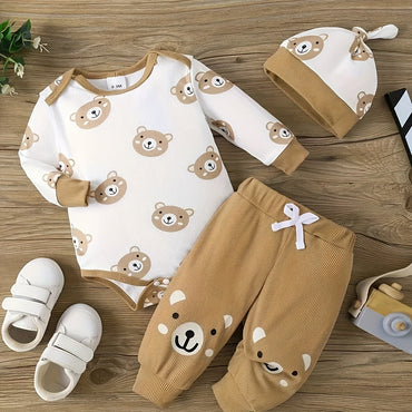 3pcs Baby Boy Outfit Set, Cute Cartoon Bear Print, Long Sleeve Crew Neck Jumpsuit with Matching Pants and Hat, Knit Fabric, Regular Fit, Polyester 95%, Spandex 5%, for Fall/Winter, for Outdoor