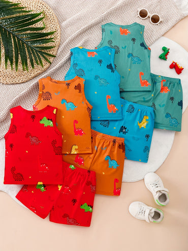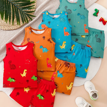 Summer Boys' Dinosaur Print Comfortable Ribbed Vest and Casual Shorts Set, Perfect for Outdoor Activities, Perfect for Outdoor