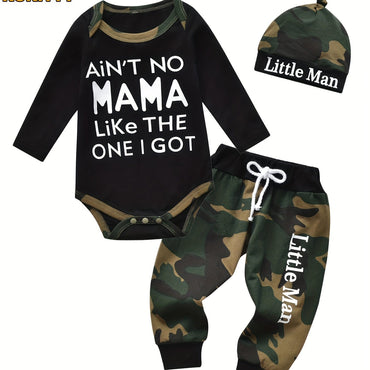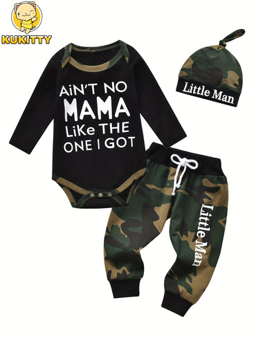 KuKitty Newborn Baby Boy Clothes Long Sleeves Letter Print Romper Camouflage Long Pants Hat 3Pcs Outfits Set