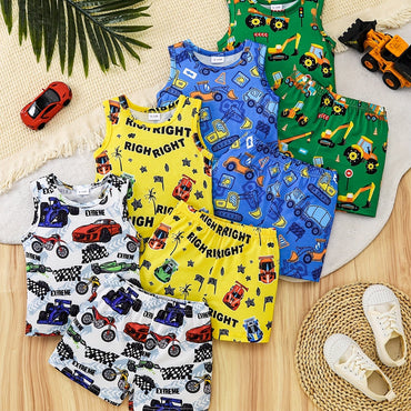 [8pcs Boys' Vest & Shorts] 8pcs Outdoor Summer Boys' Dinosaur and Car Print Vest & Shorts Set