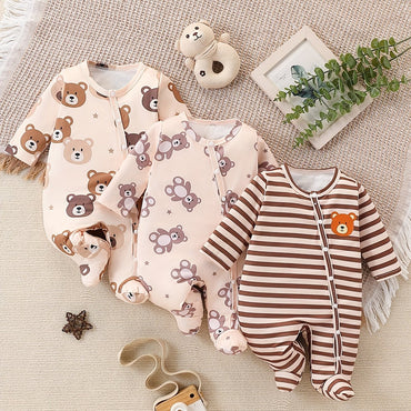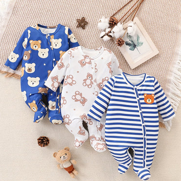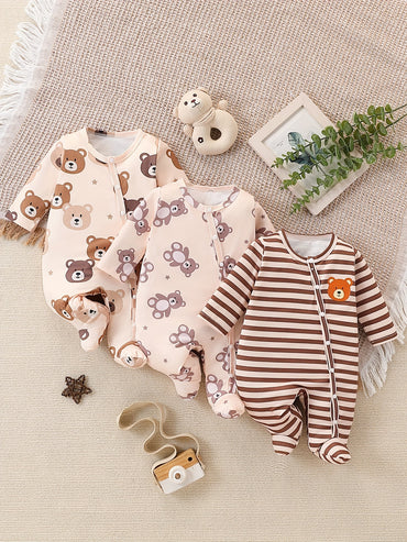 3pcs Boys' Footed Romper Set, Baby Boy's Bear Cartoon Striped Jumpsuit with Elastic and Soft Comfort, Perfect for Outdoor