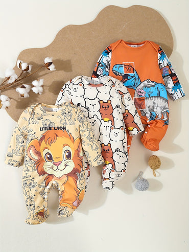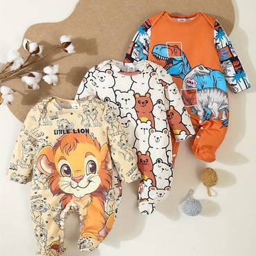 3pcs Cute Cartoon Animal Print Footed Rompers for Boys - Lion, Dinosaur, Bear Designs, Soft Knitted Fabric, Regular Fit with Button Details - Perfect for All Seasons, Baby Boys Clothes, for Outdoor
