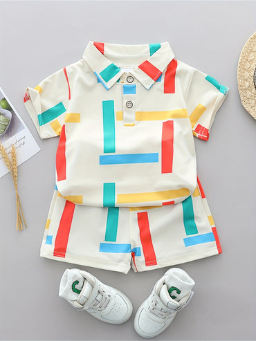 2pcs Baby's Color Clash Block Print Golf Shirt & Casual Shorts, Toddler & Infant Boy's Clothing Outdoor Set For Spring Summer