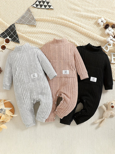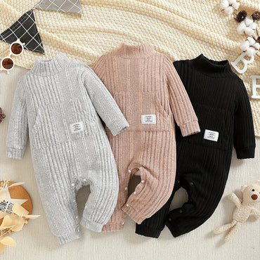 2025 New Boys' Spring and Summer Solid Color Versatile Ribbed Half-High Collar Long Sleeve Jumpsuit Set of 3, Perfect for Outdoor