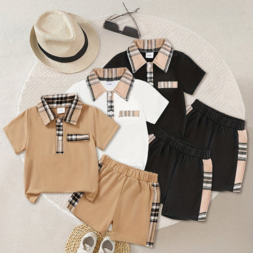 [Cute Boys' Outfit] Six-Pack Cute Boys' Plaid Shirts & Shorts | Soft Polyester Fabric, Contrasting Trim, Spring/Summer Collection, Button-Front T-Shirts & Elastic Waist Casual Shorts