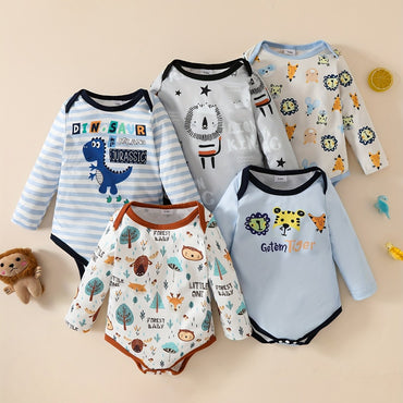 [5pcs Baby Boy Onesies] 5pcs Soft Breathable Baby Boy Onesies | All-Season Outfits with Animal & Geometric Patterns, Machine Washable Snap Closure Rompers for Newborns | Easy Diaper Change, Playful Infant Clothes, Comfortable Fit
