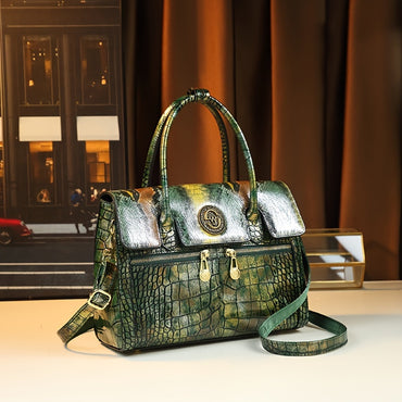 Vintage Crocodile Pattern Handbag for Women, 2023 Fashion Shoulder & Crossbody Bag with Adjustable Strap, Zipper Closure, Polyester Lined, Edge Paint Detail - Multiple Colors Available