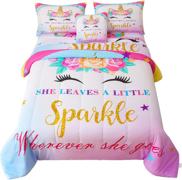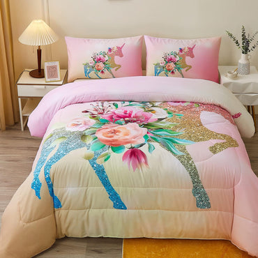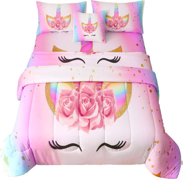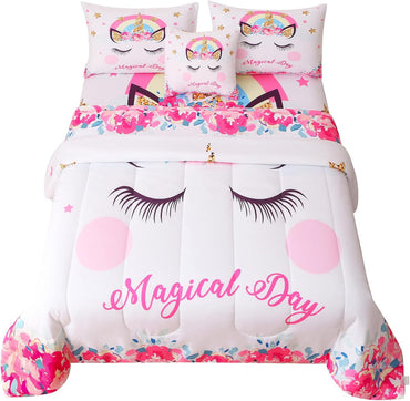 6 Pieces Unicorn Comforter Sets,3D Pink Blue Unicorn Flower Pattern,Decorative 6 Piece Bedding Sets with Comforter,Flat Sheet,Fitted Sheet,Throw Pillow Cover,Pillow Shams,Twin Size