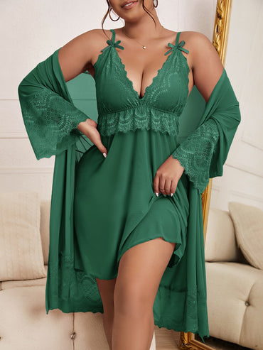 Plus Size Women's Fashionable Lace Trimmed Robe Set