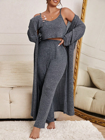 Plus Size Women's Ribbed Tank Top, Long Pants And Cardigan Home Wear Set