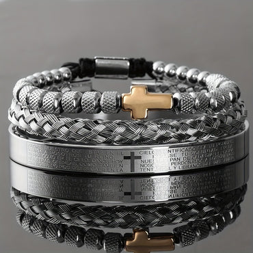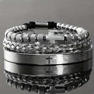 Exquisite Set Of Stainless Steel Bead Bracelet With Cross Pendant, A Charmingly Engraved Spanish Scripture Bracelet For Men's Jewelry