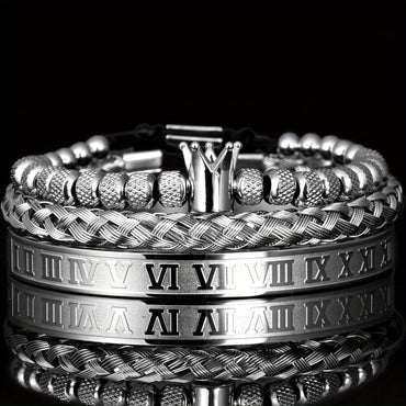 [1Set Men'S Royal Crown Charm Bracelet] 1Set MANORSAGA Men'S Stainless Steel Bracelet Set, Roman Numerals & Royal Crown Charm, Cool And Handsome Open Adjustable Bangle, 316L Lustrous Finish, Couple'S Jewelry Gift
