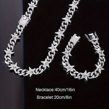2pcs/set Exquisite Cuban Chain Jewelry Set, Unisex Necklace Plus Bracelet, Men's Hip Hop Fashion With Shinny Rhinestone Decor, Perect Gift For Son