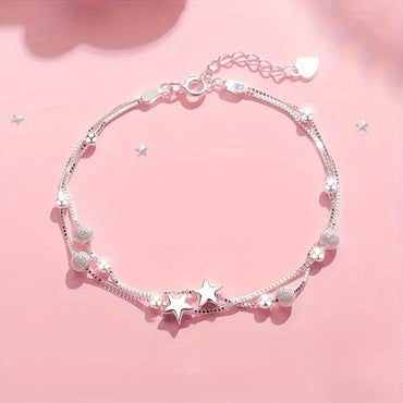 A Double-layered Silver-Plated Star Pendant Bracelet, Paired With Textured Beads, Featuring A Fashionable Style, Versatile Jewelry For All Seasons, Suitable For Daily Wear