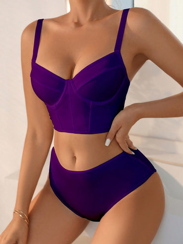 Details: Ruched Style: Casual-Casual Bra Type: Longline Features: Push Up Color: Purple Pattern Type: Plain Panty Type: Briefs...