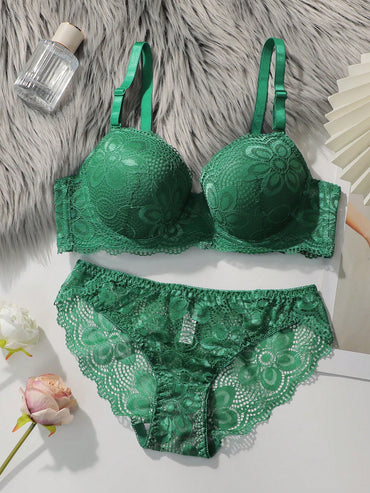 Details: Contrast Lace Style: Fantasy-Elegant Bra Type: Other Features: Push Up Color: Green Pattern Type: Plain, Plants Panty...