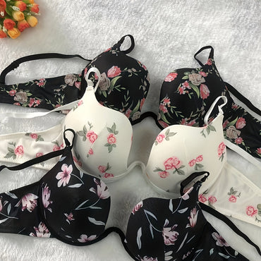 [3pcs Floral U-Shape Lingerie Bras] 3pcs Floral Lingerie Bras, Polyester and Elastane Blend, Knit Fabric, U-Shape Scoop, Floral Pattern, with Non-Removable Padding, Underwire for Adults