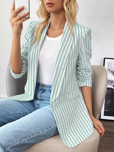 Essnce Women's Elegant Casual Fashion All-Match Old Money Style Black And White Striped Linen Shawl Collar Ruched Three-Quarter Sleeve Blazer Jacket Business Women Clothes Teacher Clothes Striped Blazer Jacket Blazer Jacket Fall Clothes Christmas Women C