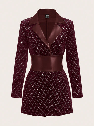 Clasi Women Blazer Style PU Velvet Diamond Jacket (With Belt)