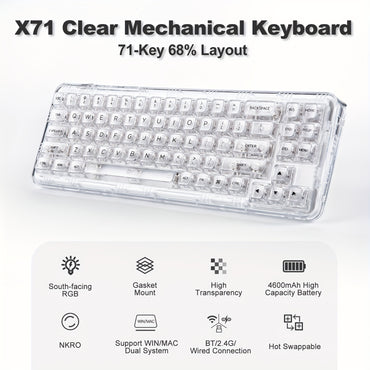 Clavier mécanique transparent blanc YUNZII X71 avec touches transparentes, clavier de jeu filaire BT5.0/2.4G/USB-C 68% de disposition 71 touches, clavier sans fil RGB à montage de joint pour Win/Mac