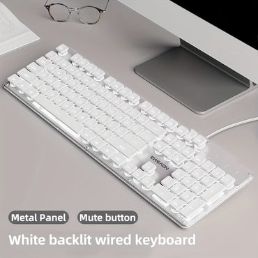 Clavier de Jeu Ergonomique EWEADN - Silencieux, Rétroéclairé LED, Pleine Taille 104 Touches avec Panneau Tout-Métal, Design Mince pour Bureau & Jeux, Compatible avec Windows/Ordinateur Portable/PC, Blanc, Pour Joueurs E-sport, Maison & Dortoir Scolaire, É