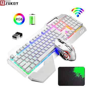 Clavier et Souris de Jeu Sans Fil QZUKOY avec Rétroéclairage Arc-en-ciel, Clavier Mécanique à Panneau Métallique Rechargeable et Souris de Jeu pour Ordinateur Portable Gamer, Noir