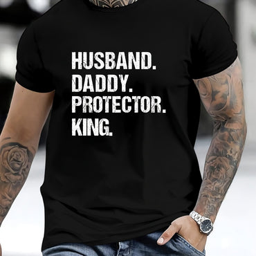 Men's "HUSBAND, DADDY, PROTECTOR, KING" Graphic Tee - 100% Cotton Casual Black T-Shirt with White Lettering, Crew Neck, Summer Wear, Perfect for Daily Outings