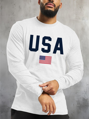 Men's USA Flag Print Long Sleeve Shirt - Stylish Crew Neck Top, Soft Polyester Blend, Casual Comfort Fit for Spring/Summer, Machine Washable, Patriotic Attire | Bold Lettering | Smooth Texture, American Flag Clothes