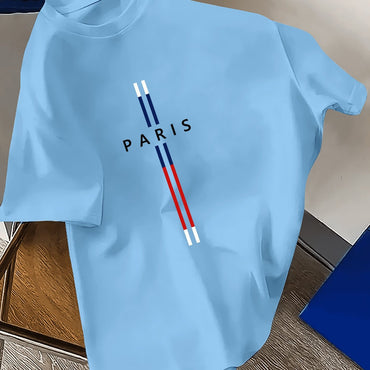 [Geometric Paris Print Tee] Summer Geometric Paris Print Polyester T-Shirt - 1pc Men's Casual Round Neck Stretch Fit Top for Adults
