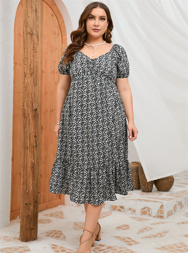 Plus Size Summer Short Sleeve Puff Sleeve Sweet A Line Ruffled Mid Length Dress