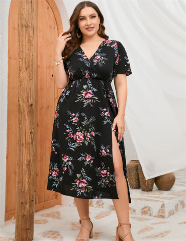 Plus Size Dress Summer Short Sleeve Flying Sleeve Staggery Waist High Waist Front Split Dress