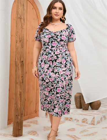 Plus Size Women Summer Puff Sleeve Slim Fit High Waist Hip Dress Rear Split Dress
