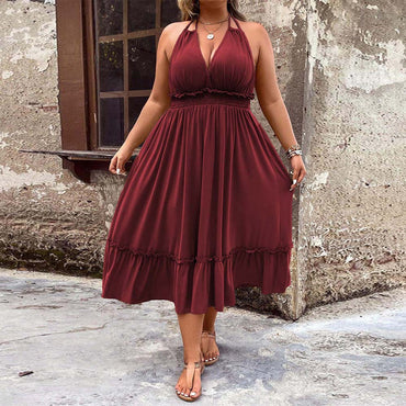 Plus Size Women Roman Vacation Dress Summer V neck Halter Midi Dress