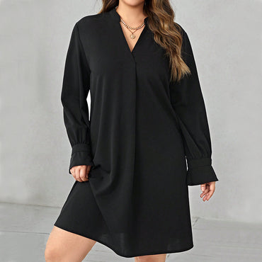 Plus Size Women Clothes Autumn Winter V Neck Solid Color Long Sleeve Loose Casual Dress