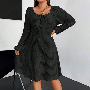 Plus Size Autumn Winter Women Square Collar Mid Length Waist Office Long Sleeve Dress