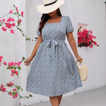 Plus Size Women Floral Summer Dress Square Collar Short Sleeve Belt Pleated Hem A line Wave