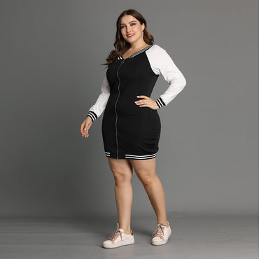 Plus Size Autumn Women Long Sleeve Color Zipper Dress Mid-Length