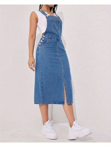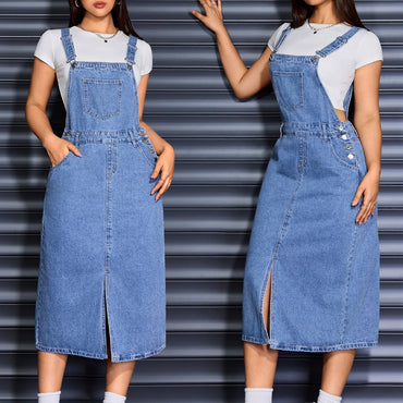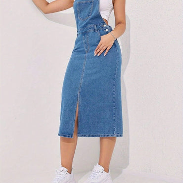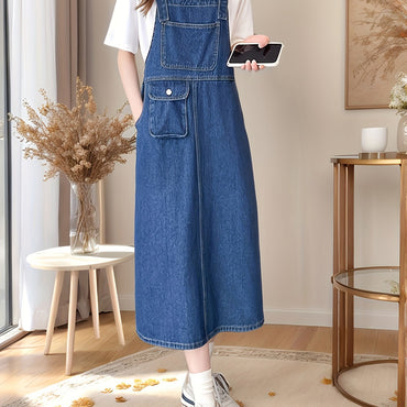 Women'S Front Pocket Straight Slit Long Denim Dress Elastic Suspender Long Skirt